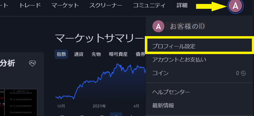 ②TradingViewのアイコンをクリックし、「プロフィール設定」を選択します。